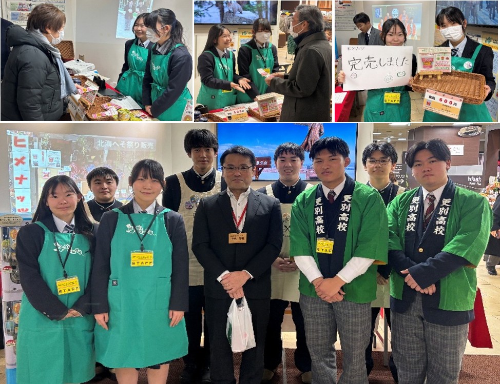 参加した2名は普通科の生徒で、初めての販売活動でした。最初はなかなか声も出せず、苦戦しましたが、プロの販売員の方のレクチャーのおかげもあって、次第にお客様とのコミュニケーションを取れるようになりました。北海道教育委員会教育長や、本校の岡本校長先生も駆けつけてくれました。今回参加した生徒にとって貴重な体験になったとともに、今後の学校の活動につなげていってほしいと思います。
