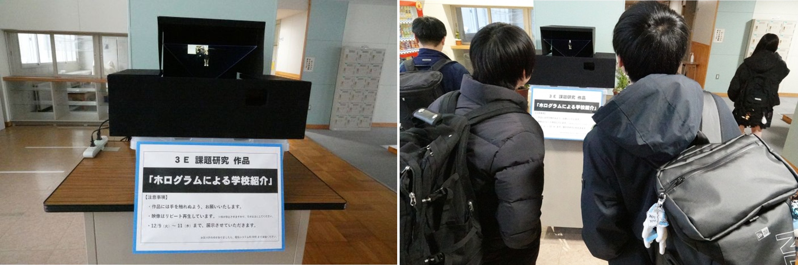 12月9日~11日、電気システム科3年次の課題研究で製作した「ホログラムによる学校紹介」を、生徒ホールMoiで展示しています。