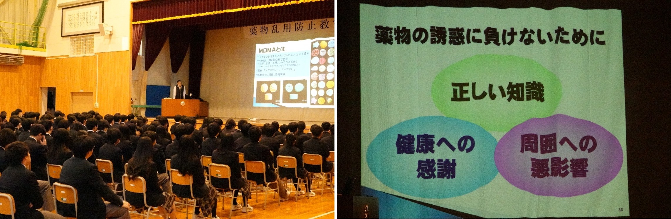 講話では、乱用薬物の再確認、薬物乱用による悪影響について話がありました。また、注射針の痕や薬物の写真を見ながら薬物の恐ろしさが語られ、絶対に手を出さないようにと注意喚起がなされました。さらに、オーバードーズ(医薬品の過量服薬)やフラッシュバックにも触れ、薬物の誘惑に負けないよう正しい知識を付けてほしいとお話がありました。