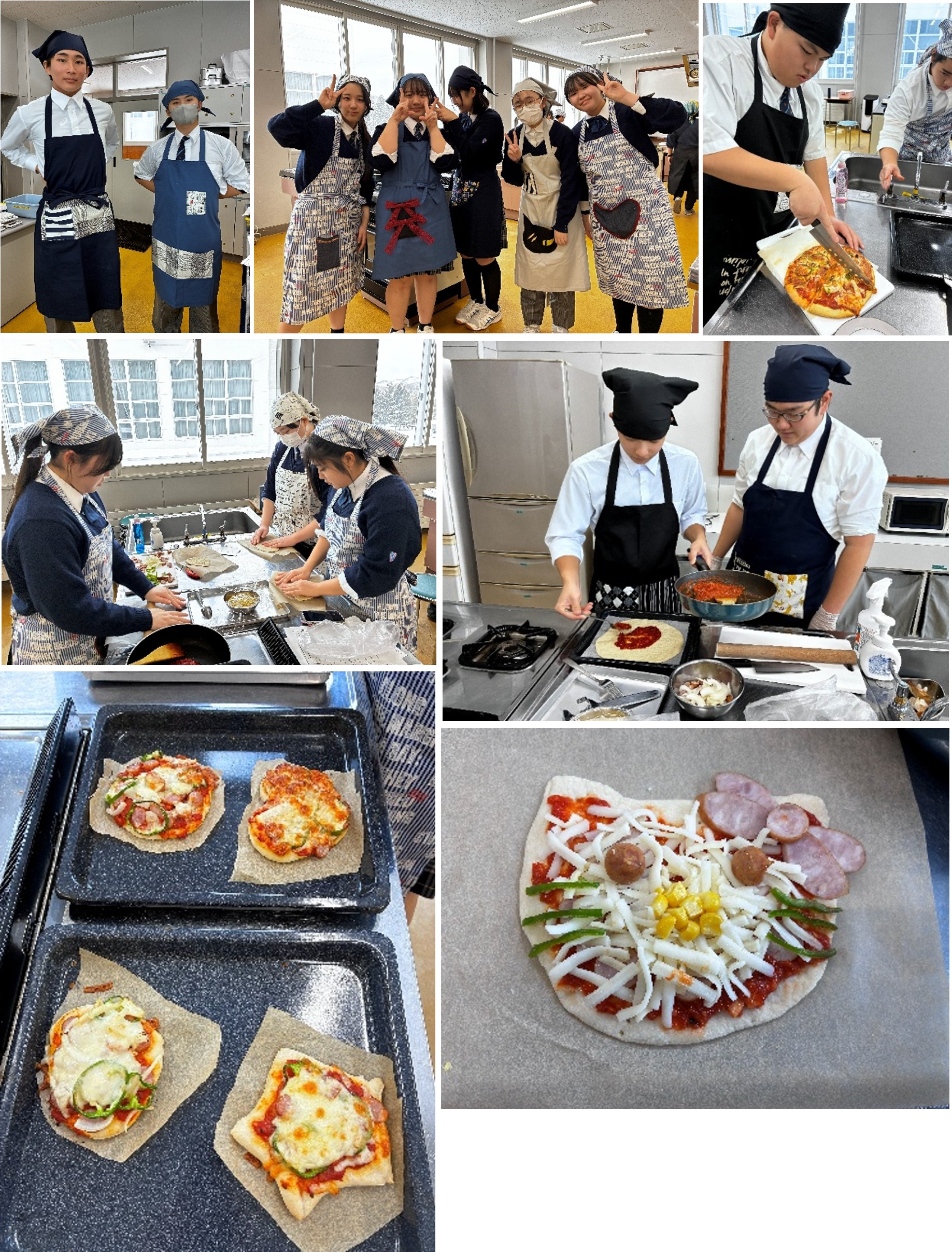 家庭総合の被服実習で、「オリジナルエプロン・三角巾・巾ちゃく」を制作し、全員完成したことの記念に調理実習「手作りピザ」を行いました。