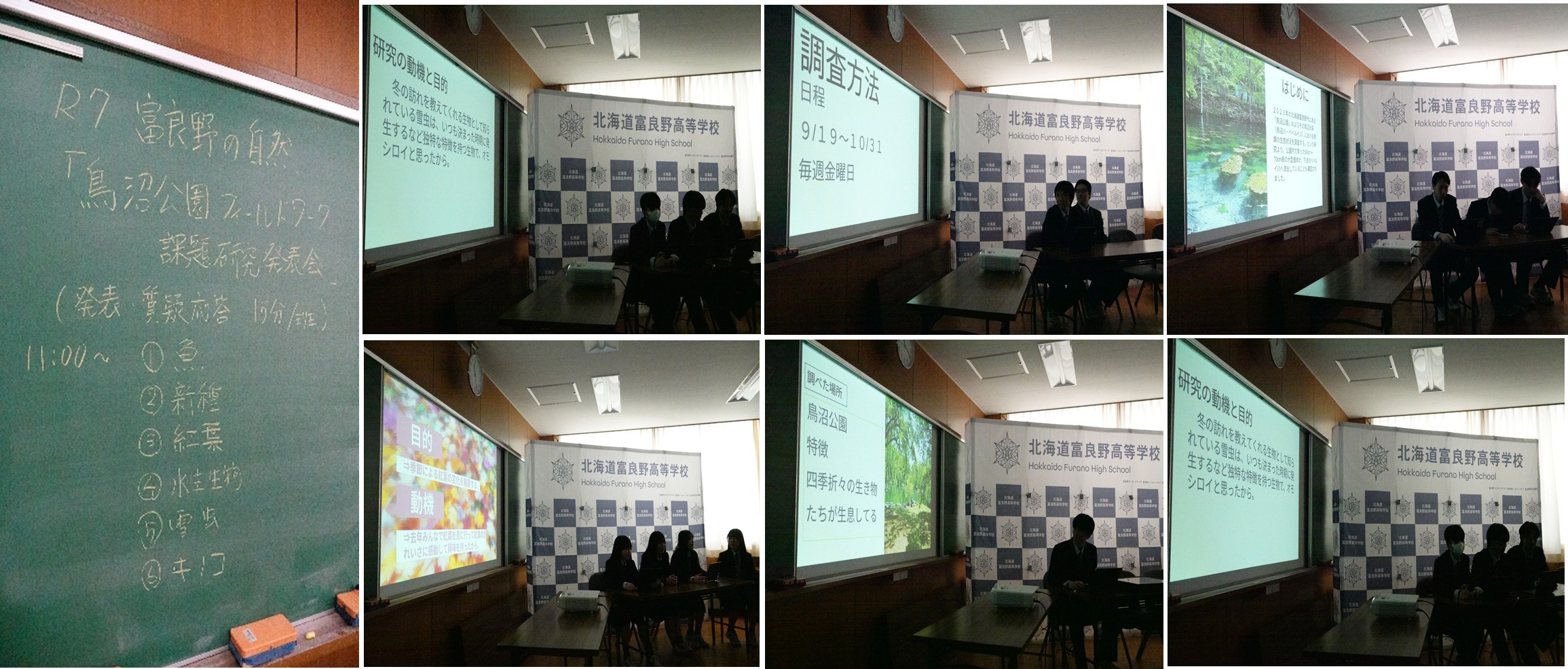 1月16日、異年次履修「富良野の自然」において、「鳥沼公園フィールドワーク課題研究発表会」を実施しました。選択生徒19名が6班に分かれ、各班が鳥沼公園で見つけた課題研究に取り組み、約2ヶ月の研究成果を発表しました。