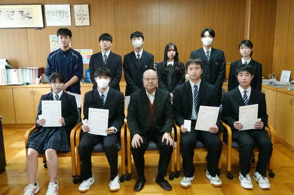 1月20日(火)、富良野交通安全協会令和7年度「交通安全標語コンクール」の表彰式が、本校校長室で行われました。富良野交通安全協会会長の佐藤様より入賞者一人ひとりに賞状と記念品が手渡され、表彰式後は標語応募の感謝のお言葉とともに、交通事故の現状や交通ルール遵守の大切さなど貴重なお話もいただきました。
