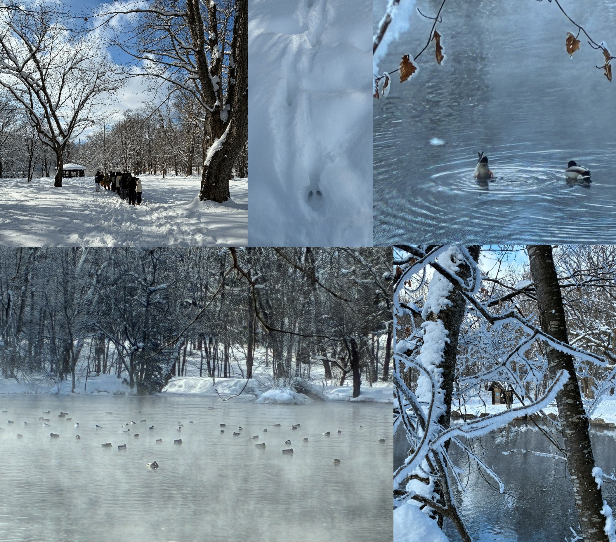 1月23日、異年次履修「富良野の自然」で鳥沼公園に行きました。氷点下15℃のキリッと冷え込んだ公園には、モモンガの食べ散らかしたと思われる痕跡、エゾシカなどの足跡が見られ、野生動物の存在を感じることができました。池では飛来してきたマガモやコガモがたくさんおり、魚獲りの様子などを見ることができました。また、池のほとりにある木々には霧氷(むひょう・池から蒸発した水分が枝の池側に凍り付く)が見られ、厳しい冬ならではの光景を堪能することができました。