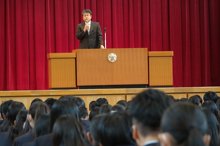 生徒指導部長から、校内ルールの遵守、通学時の交通安全マナーの確認とルールの遵守が伝えられ、お互いに気持ちよい学校生活を送りましょうと伝えられました。