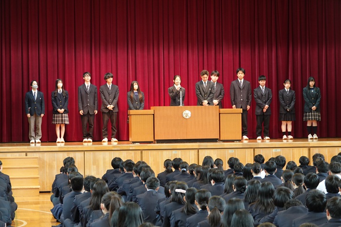 交通安全・防犯に関する注意喚起、自転車の乗車マナーについて、事例を交えて再確認が伝えられました。最後は、生徒会長の置田さんが生徒安全宣言を行いました。