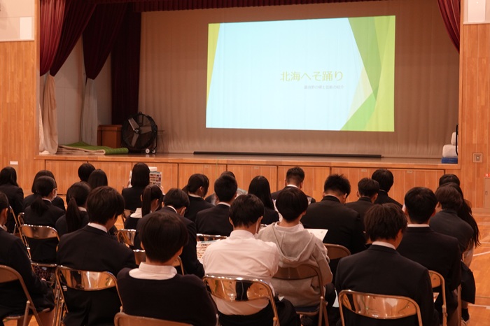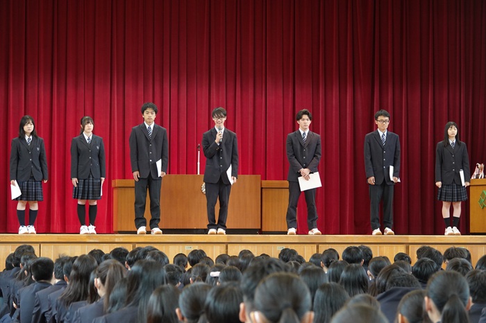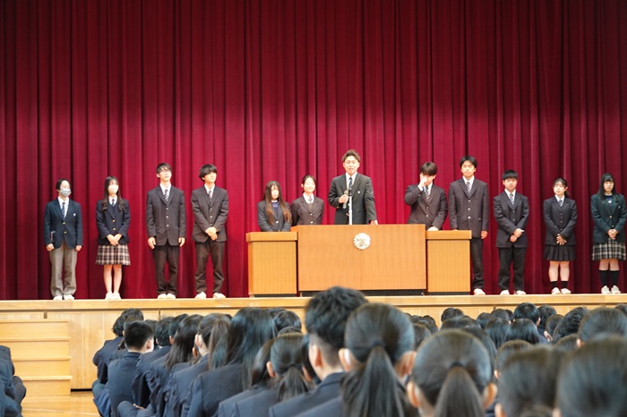 該当部員が登壇して、賞状披露と伝達が行われました。その後、文化部で全道大会に出場する各部部長から挨拶があり、生徒の大きな拍手によるエールが贈られました。