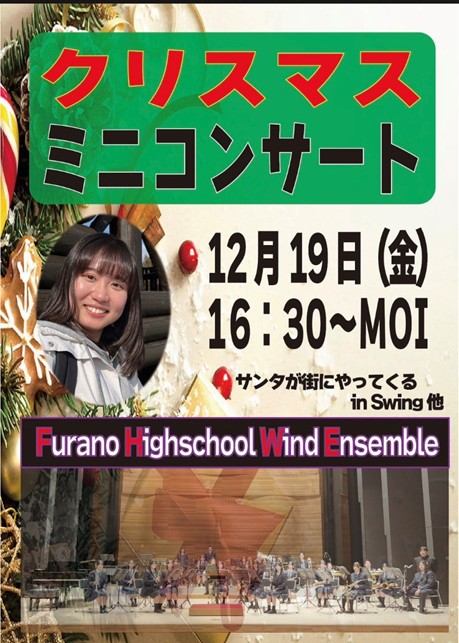 12月19日(金)16:30~MOI(生徒玄関ホール)にて、吹奏楽部のクリスマスミニコンサートを開催します。「サンタが街にやってくる in Swing」他、クリスマスを感じられる曲を演奏します。お楽しみに!