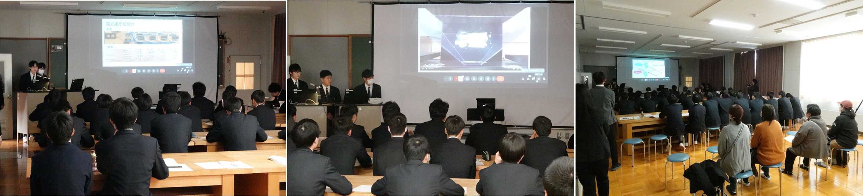 今年度の課題研究も「ホログラムによる学校紹介」「聴覚に障がいを持った方への技術的支援」「多機能付机の製作」と力作が揃いました。どの班も今後の課題がたくさん出て、後輩たちにぜひ引き継いでほしいと訴えていた班もあり、志半ばで一区切りする辛さが滲み出ていました。