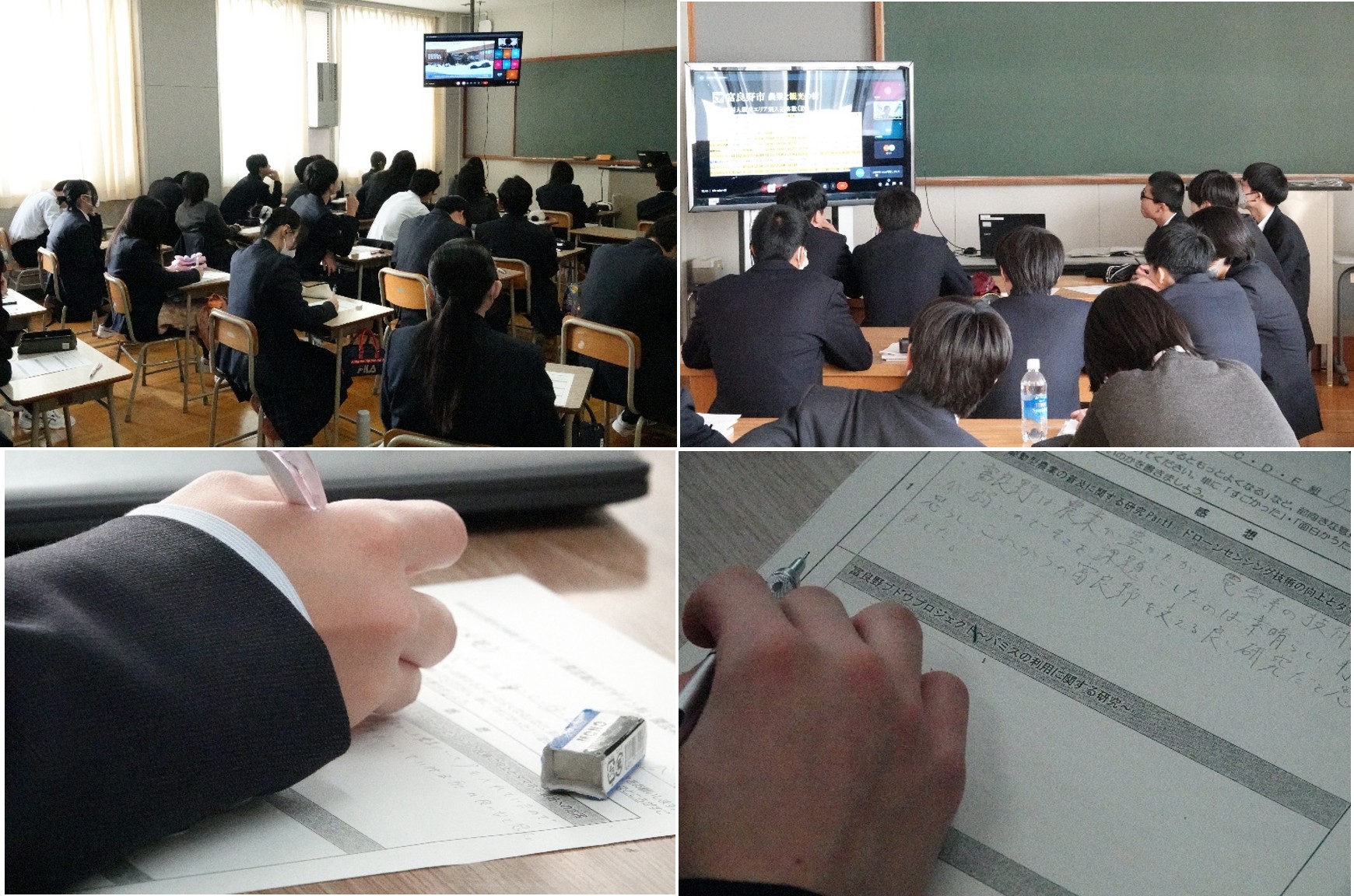 また、当日は、テーマ設定・研究経過・発表手法などを学ぶ目的で、1年次普通科・園芸観光デザイン科、2年次普通科において、本発表会をモニター越しではありましたが、総合的な探究の時間の一環として視聴しました。統合したことによる試みの1であり、生徒同士、学科間の研究活動や探究活動の刺激になったことと思います。