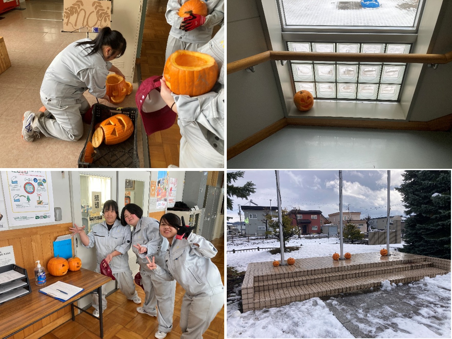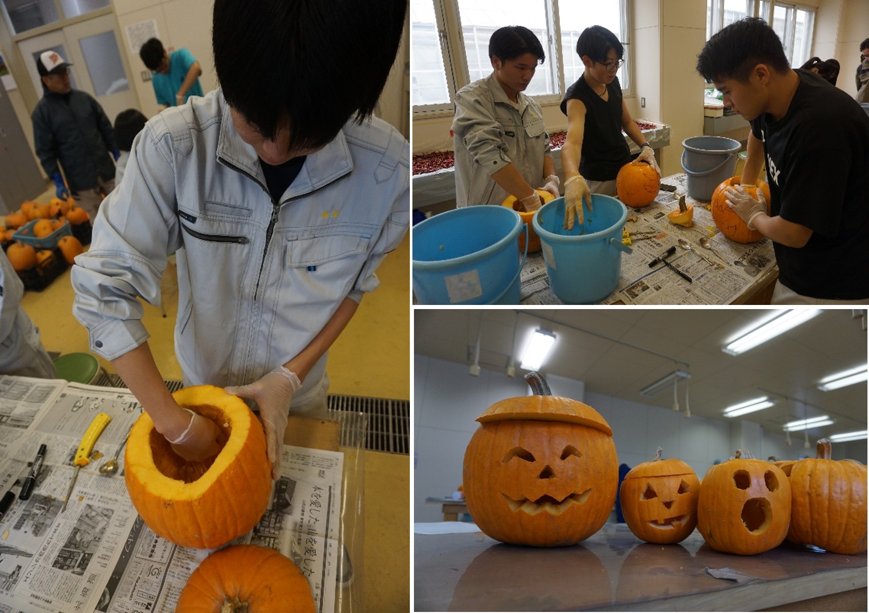 園芸観光デザイン科1年次生が半年かけて育てた観賞用カボチャを、構内(校内や前庭など)の数カ所に配置しました。期間限定でハロウィーン気分を味わってもらえればと思います。