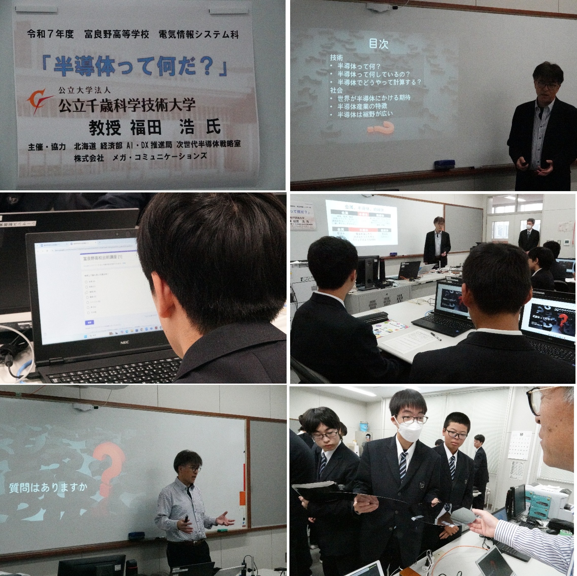 10月16日(木)、電気情報システム科1年次生が、半導体講座を受講しました。この講座は、北海道経済部AI・DX推進局次世代半導体戦略室と株式会社メガ・コミュニケーションズの主催・協力により、公立大学法人公立千歳科学技術大学の福田浩教授が来校して、行われました。