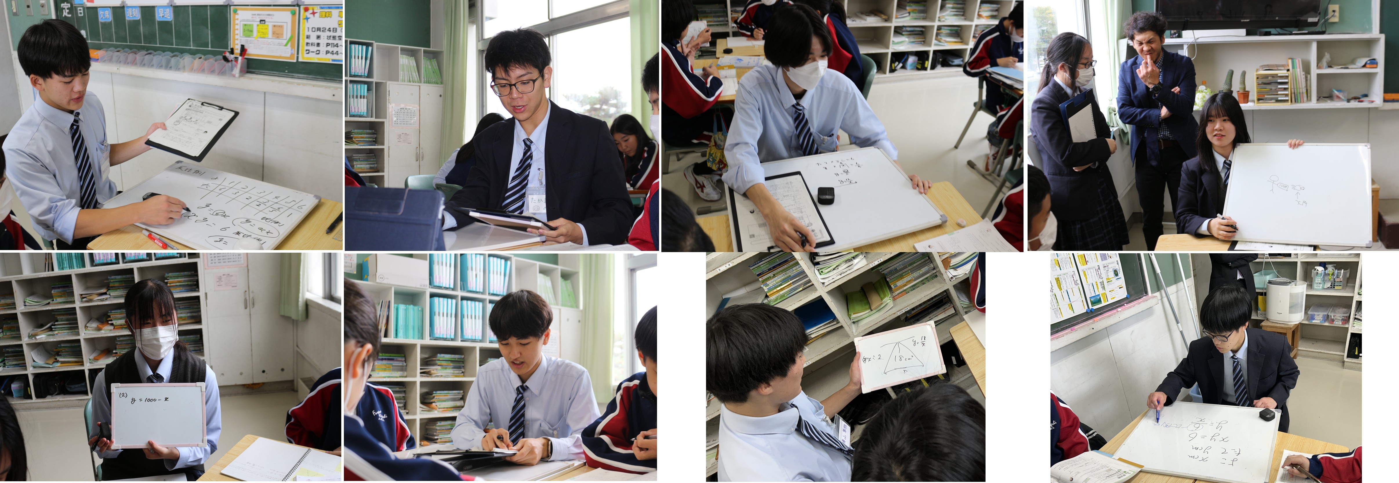 授業では、高校生1名につき中学生2,3名のグループを作り、「反比例」の仕組みについてグループごとに高校生が説明しました。高校生にとっては、論理的に相手に伝える難しさを体験でき、数学本来の理解が深まった1時間となりました。また、中学生も年齢の近い高校生と数学に取り組むことで、積極的に説明を聞く姿が見られました。