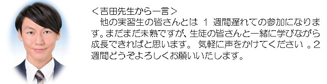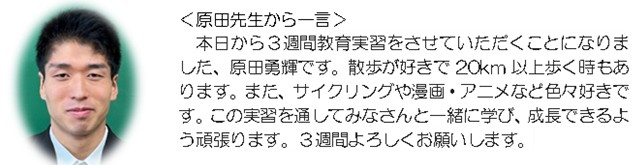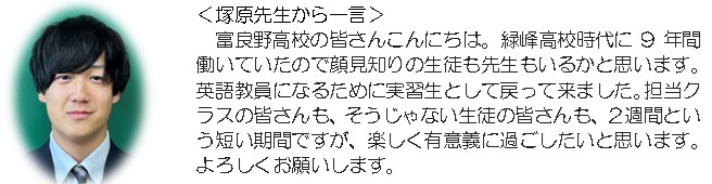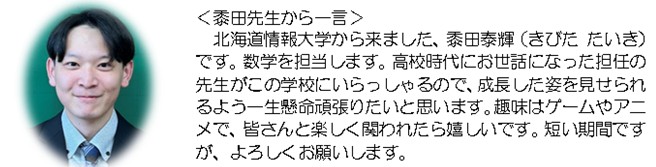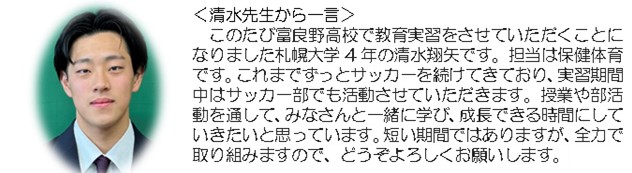 また、旧富良野高校、旧富良野緑峰高校の卒業生等5名が教育実習で本校に来ており、紹介がありました。教育実習生は明るく元気よく本校生徒と接してくれています。本校生徒にとっても、よい刺激となっていることでしょう。