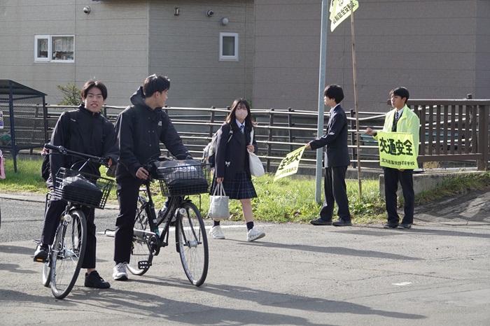 各クラスの後期常任風紀委員、保護者、教員が、交通量の多い通学路(5カ所)で交通ルールの街頭啓発を行いました。