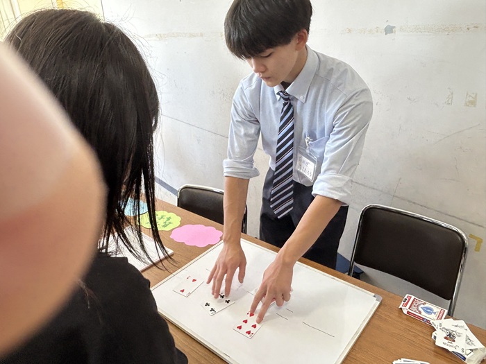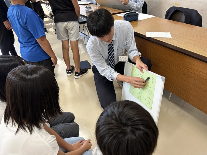 準備した算数教材は、算数の楽しさや不思議さを小学生に伝えるとともに、今後の算数・数学の授業に興味をもって取り組むことができるものばかりでした。説明を受けた小学生は、興味をもって高校生の話を真剣に聞いてくれていました。