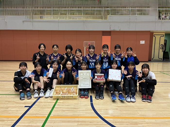 スイーツの町砂川市にちなんだ大会で、順位に応じて砂川市の銘菓をいただけるという魅力的な大会です。砂川地区バレーボール協会の皆様をはじめ、各協賛企業様、砂川中学校女子バレーボール部の皆様には大変お世話になりました。この場を借りてお礼申し上げます。惜しくも優勝を逃してしまいましたが、また出場する機会がありましたら優勝したいと思います。スイーツとってもおいしかったです!!(詳細は部活動のページに掲載しています。)