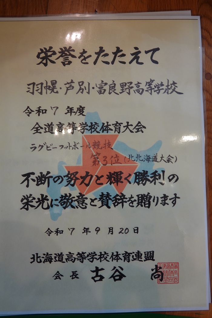 令和7年度ラグビーフットボール競技 北北海道大会 第3位(9/20 北見市)賞状伝達、全道大会壮行会、教育実習生の紹介が行われました(2025/10/8 up)