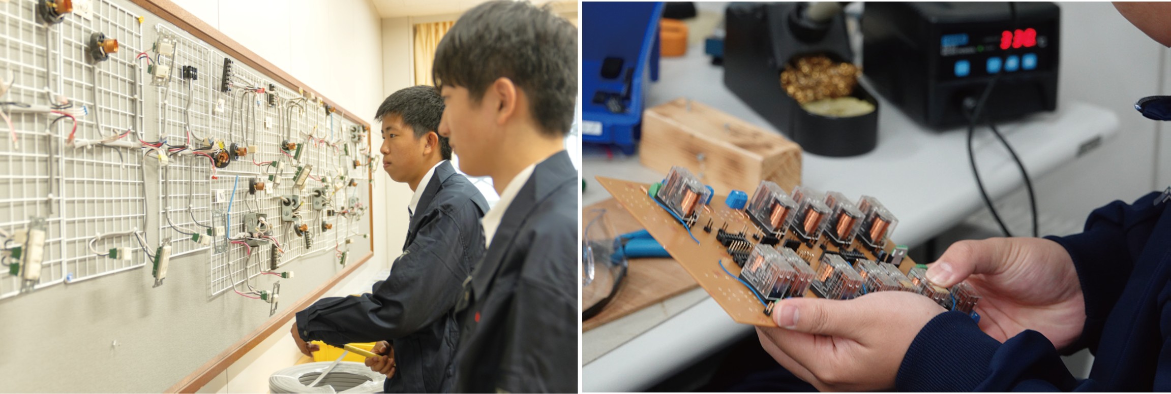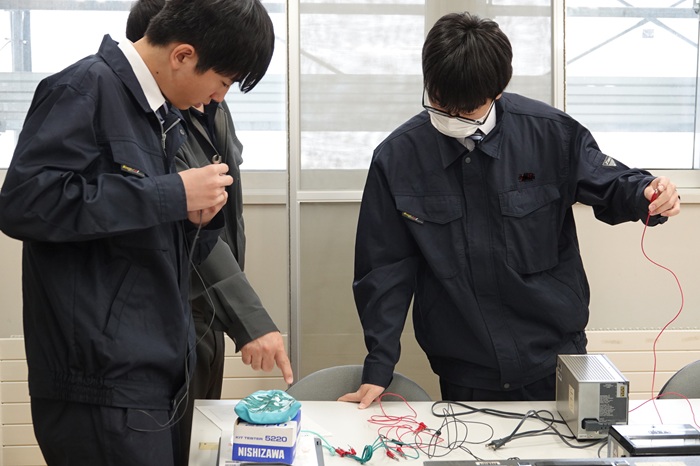 私は将来、自動車整備士になりたくて自動車専門学校への進学を考えています。近年の指導者は電気や電子制御技術が多く使われているため、高校では電気の基礎をしっかりと身につけてから進学したいと思い、電気情報システム科を選択しました。この科では、電気の基礎からプログラミングのことまでいろいろなことを学ぶことができます。最初は難しいと感じるかもしれませんが、先生方や先輩方が優しく丁寧に教えてくれるので、安心です。この科での学びは将来の選択肢が広がると思っています。